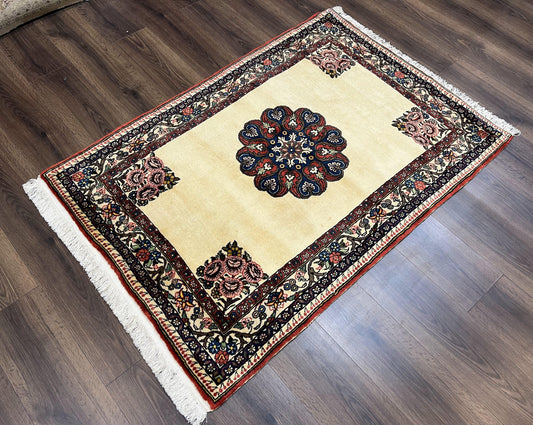 Persian Bidjar Rug 3x5, Open Field Medallion, Hand Knotted, Ivory/Cream Red Blue, Wool Oriental Bijar Carpet, 3 x 5 Vintage Area Rug, Floral Roses, Fine