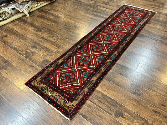 Persian Tribal Runner 3 x 9, Hamadan Dargazin Rug, Dark Blue and Red Wool Hand Knotted Hallway Rug, Vintage Antique Oriental Runner, 9ft Long Runner, Herati