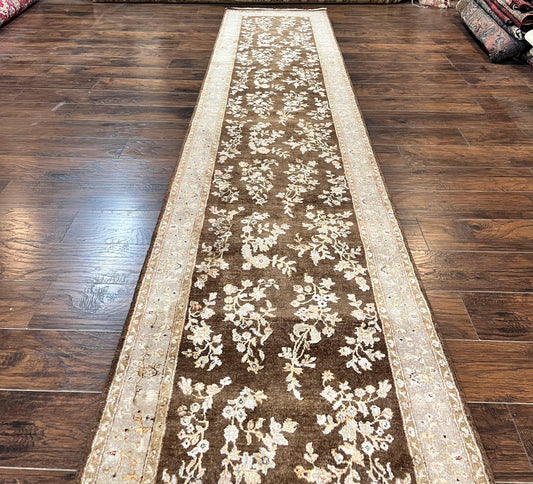 Peshawar Runner Rug 3 x 20, Wool Hand Knotted Vintage Pakistani Carpet, Brown & Taupe, Chobi Mahal Floral Rug, Extra Long Hallway Runner