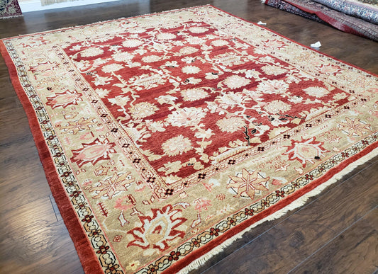 Peshawar Rug 9.5 x 10.8, Almost Square Size, Red and Beige Chobi Sultanabad Rug, Shah Abbas Flowers, Wool Handmade, Vintage Oriental Carpet