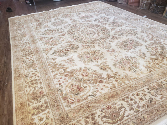 Sino Persian Rug 9x12, Wool on Silk Foundation Hand Knotted Ivory Vintage Carpet, Birds Design, Very Fine Room Sized Floral Oriental Rug