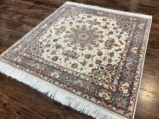 Sino Persian Square Rug 5x5, Very Fine Oriental Carpet, Wool & Silk Highlights, Ivory, Hand Knotted Handmade Vintage Traditional Rug