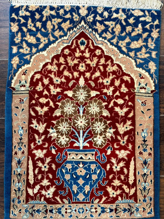 Small Persian Nain Rug, Persian Vase Tree of Life Design, Red and Blue, Very Fine 260 KPSI, Wool and Silk Highlights