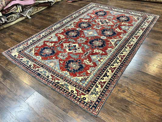 Turkish Heriz Rug 7x10, Wool Hand Knotted Handmade Room Sized Oriental Carpet, Red & Ivory, Vintage Geometric Oriental Rug 7 x 10 ft