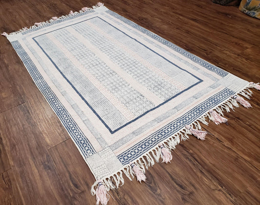 Vintage Moroccan Kilim Area Rug 4x6, Ivory & Blues, Moroccan Wall Hanging, Wool, Handmade, 3'9" x 6' 1", Boho Rug, Flatweave Moroccan Carpet