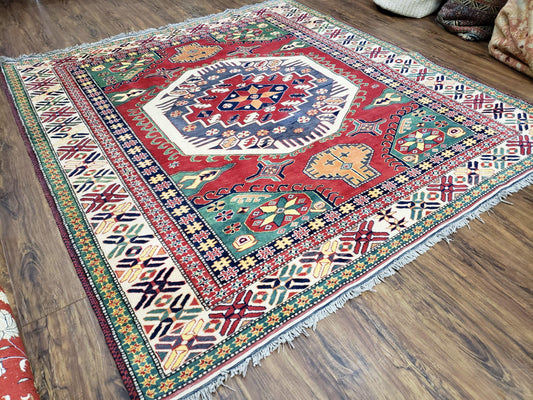 Vintage Turkish Kazak Area Rug, 6ft Square Rug, 6x6 Square Oriental Carpet, Hand-Knotted, Wool, Bold Colors, Red Blue Green, Geometric Rug