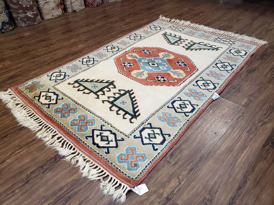 Vintage Turkish Rug 4x6, Beige Red Gray Carpet, Caucasian Design, Tribal Rug, Hand-Knotted, Boho Rug, Bohemian Home Decor