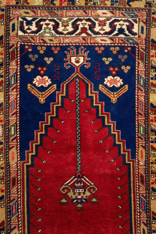 Vintage Turkish Area Rug 4x6, Wool Hand-Knotted, Red & Dark Blue Turkish Persian Pattern Oriental Carpet, 4 x 6 Decorative 1960s Foyer Rug