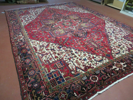 Wonderful Persian Heriz Rug 8.6 x 11, Geometric Heriz Carpet, Semi Antique Decorative Area Rug, Red Ivory Dark Blue Handmade Wool Room Sized