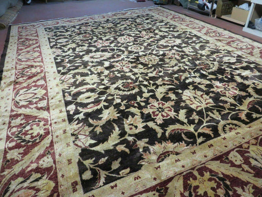 11' X 15' Vintage Hand Knotted Indian Agra Wool Rug Hand Made Dark Brown Floral