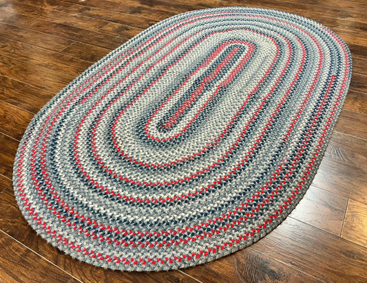 American Oval Braided Rug 5x8 Wool Handmade Vintage Carpet, Multicolor, Blues Gray Cream