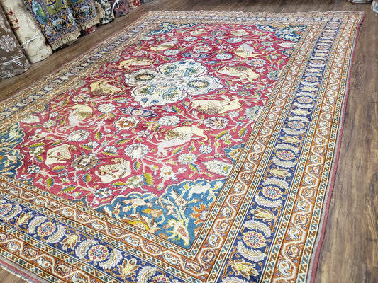 Antique Turkish Sivas Area Rug 8x11, Hand-Knotted, Vintage Red Wool Carpet, Gazelles Lions, Boteh Border, 8' x 11' Top Quality Oriental Rug