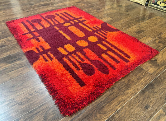 Danish Rya Shag Rug 4x6, Red Vintage Mid Century Retro Abstract Shag Rug