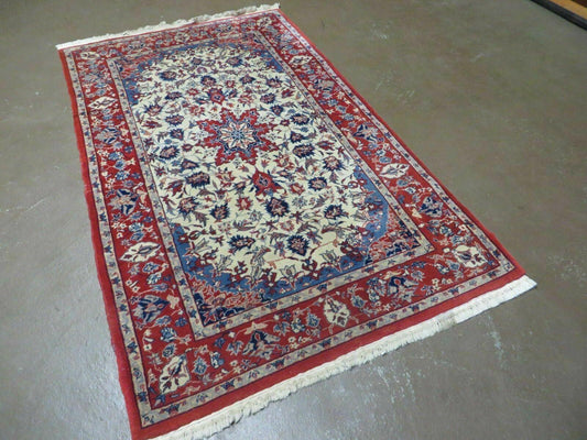 3' X 5' Vintage Handmade Authentic Oriental Floral Medallion Fine Wool Rug Beige Red and Blue Top Quality Veg Dyes