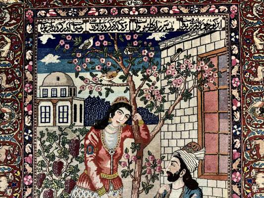 Wonderful Persian Kashan Pictorial Rug 4.7 x 6.5, Persian Rug for Wall Hanging, Handmade Antique Wool Carpet Animal Motifs Poetry Lovers, 240 KPSI