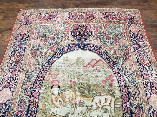 Antique Persian Kerman Lavar Rug 4.4 x 7.5, Highly Collectible Rare, 1880s Rug, Millefleurs, Cows, Wool Hand Knotted, Pictorial