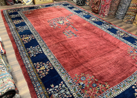Large Persian Sarouk Rug 10x17, Open Field, Red and Navy Blue, Palace Sized Oversized Hand Knotted Wool Oriental Carpet Flowers Vases Antique 1920s