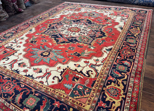 Persian Heriz Serapi Rug 8 x 10.6, Geometric Medallion, Great Colors, Rare, Red Navy Blue Ivory