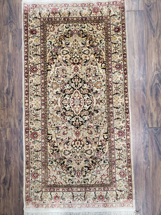 Silk Oriental Rug 1' 7" x 3', Very Fine Silk Carpet, Small Silk Rug, Traditional Floral Medallion, Hand-Knotted Cream Beige Vintage Silk Rug