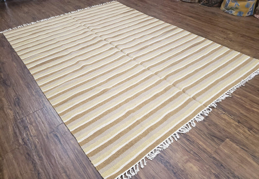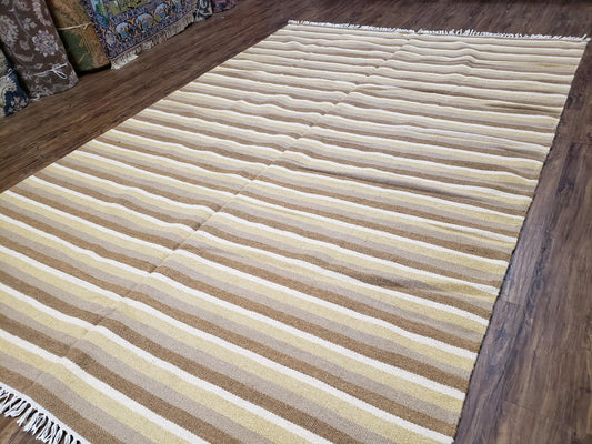 New Indian Kilim Area Rug, 6x8 - 7x8 South American Style Blanket, Striped Indian Wool Hand-Woven Flat Weave 6x9 Bedroom Rug, Ivory Ochre