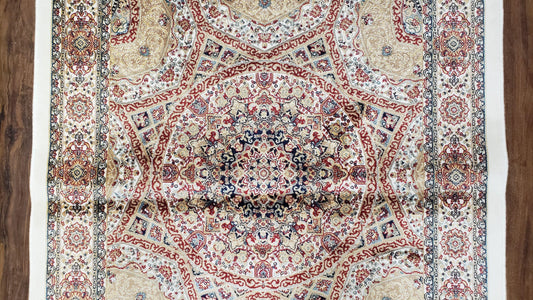 Persian Design Silk Accent Rug, Dome Medallion, Allover Pattern Oriental Carpet, Small Silk Rug, Cream, Ivory, Bamboo Silk, 2' 8" x 4' 1"