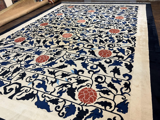 Antique Chinese Peking Rug 10x14, Beige Black, Handmade Wool Art Deco Carpet