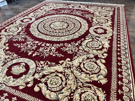 Aubusson Rug 9x12, Wool Handmade Carpet, Elegant French European Design, Dark Maroon Red, 9 x 12 Room Sized Rug, Finely Hand Knotted
