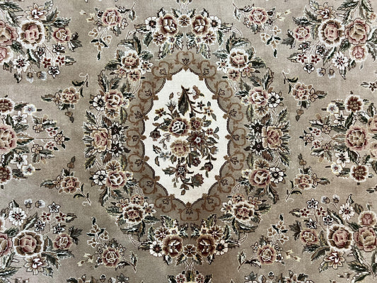 Sino Persian Rug 8x10, Soft Wool, Silk Highlights, Hand Knotted Vintage Carpet, Taupe & Ivory, Floral, Traditional Rug 8 x 10