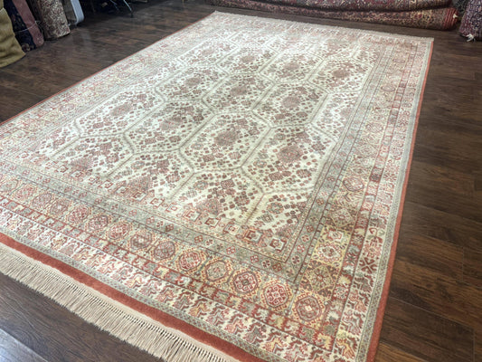 Indo Chinese Rug 9x12, Asian Oriental Carpet 9 x 12, Cream & Burnt Orange, Handmade Wool Vintage Art Deco Rug