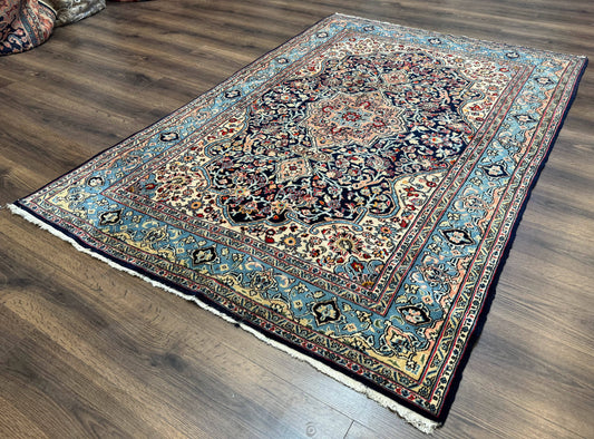 Persian Nain Rug 8x11, Navy Blue and Ivory, Handmade Wool Vintage Carpet, Floral Medallion