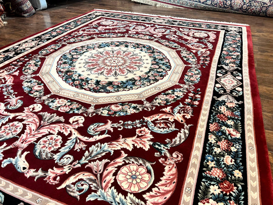 Chinese Aubusson Rug 9x12, Burgundy, Handmade Vintage Wool Carpet, Fine 210 KPSI, Elegant European Design