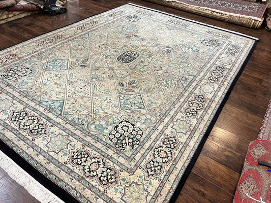 Sino Persian Silk Rug 6.4 x 9.9, Very Fine Hand Knotted Carpet, Panel Design Multicolor, Silk Pile on Silk Foundation, Handmade Vintage