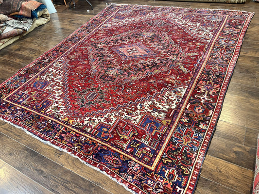 Persian Heriz Rug 9x11 ft, Geometric Rug 9 x 11, Red Room Sized Semi Antique Vintage Wool Hand Knotted Oriental Carpet
