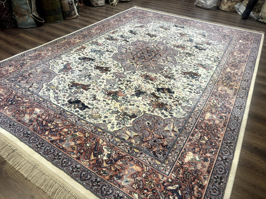 Persian Tabriz Rug 8x10, Antique Authentic Wool Oriental Carpet 8 x 10 ft, Bird Motifs Floral Boteh Paisleys, Cream Red Blue Vintage Handmade Rug