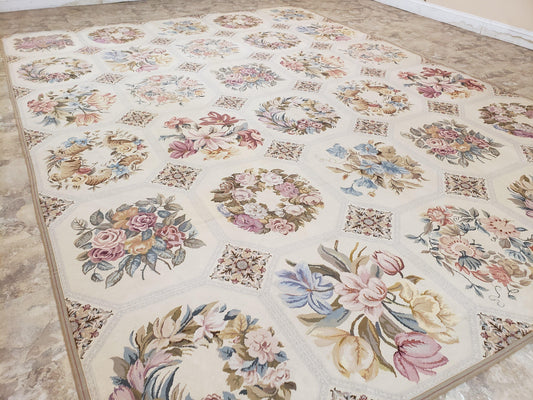 Needlepoint Rug 10x14 Wool Flatweave Carpet, English Floral Pattern, Pale Yellow, Roses, Allover Pattern, Handmade Large Needlepoint Nice