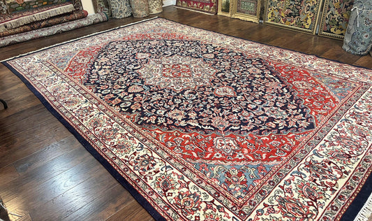 Indo Persian Sarouk Rug 10x14, Large Red and Navy Blue Carpet, Traditional Floral Wool Rug