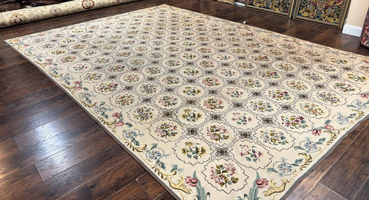 Needlepoint Rug 10x14, Wool Handmade Vintage Needlepoint Carpet, Floral Panel Design, Ivory/Cream
