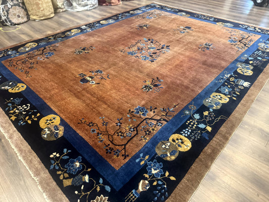 Antique Chinese Wool Rug 9x12, Light Brown and Navy Blue, Fete Peking Art Deco