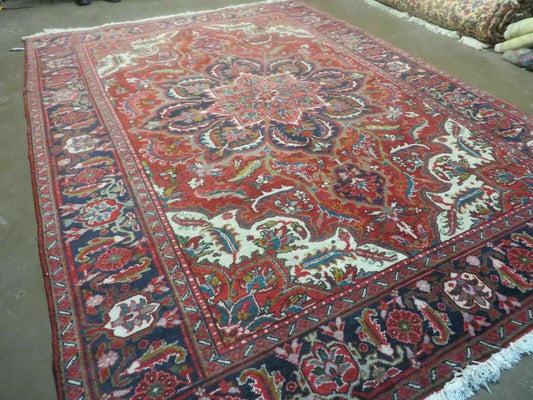 Persian Heriz Rug 7.5 x 10, Room Sized Heriz Ahar Carpet, Semi Antique Vintage Floral Large Medallion Rug, Red and Navy Blue, Hand Knotted Wool Rug