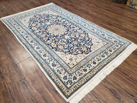 Persian Nain Rug 4x6, Ivory and Blue, Hand-Knotted, Wool & Silk