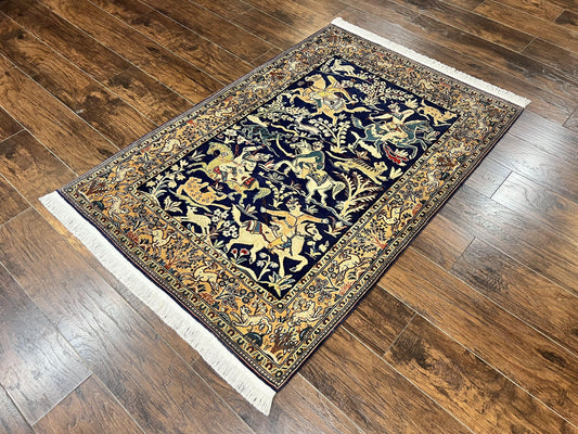 Persian Qum Hunting Design Rug 4x5, Wool Hand Knotted Vintage Oriental Carpet, Navy Blue & Mustard, Horsemen Animal Pictorials, Rare