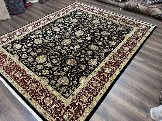 Indo Persian Rug 8x10, Black and Maroon Floral Allover Wool and Silk Oriental Carpet 8 x 10 ft, Hand Knotted Traditional Vintage Room Sized