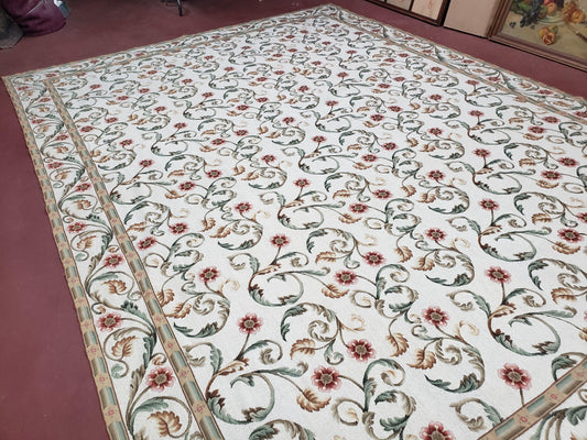 New Needlepoint Rug 9x12, Hand Woven Wool Area Rug, Flatweave Carpet, Handmade Chinese Needlepoint, Floral European Design, Ivory Background