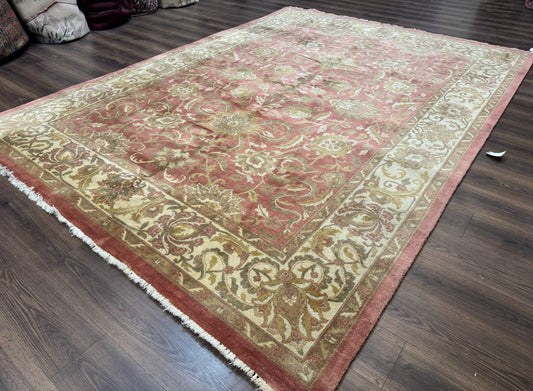 Indian Rug 8x11, Coral and Beige, Floral, Traditional Vintage Wool Carpet