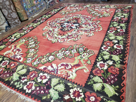 Karabakh Rug 8x11, Caucasian Kilim Rug, Vintage Antique Turkish Anatolian Azerbaijani Carpet, Wool Red & Black Hand-Woven 8 x 11 Living Room