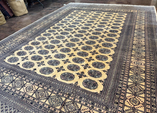 Pakistani Bokhara Turkoman Rug 9x11, Cream, Handmade Wool Vintage Carpet