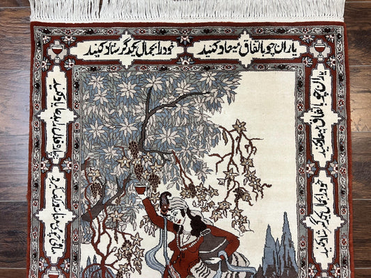 Indo Persian Pictorial Rug 3x5, Omar Khayyam Poetry in Borders, Dancer, Handmade Vintage Wool, Rug for Wall