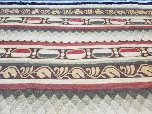 Large Vintage Striped Rug, Handmade, Earth Tone Decor, Beiges Slate Gray Dark Red, Flatweave Indian Striped Carpet, Indian Kilim 10x14, Wool