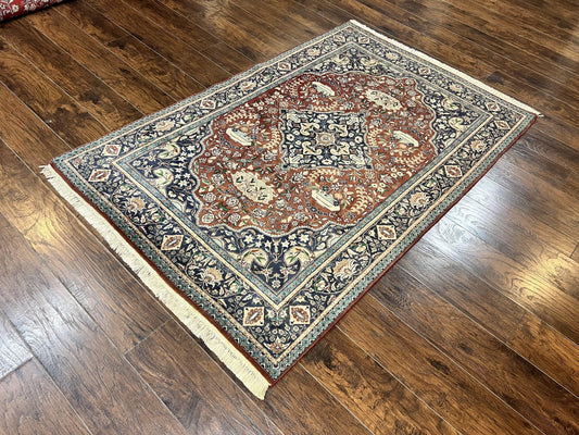 Persian Nain Rug 3x5, Floral Medallion Oriental Carpet, Very Fine Hand Knotted Handmade Wool and Silk Highlights Rug, Vintage Semi Antique