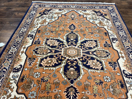 Indo Heriz Rug 6x8, Wool Hand Knotted Vintage Oriental Carpet, Orange-Red Ivory & Navy Blue, Medallion Rug, Handmade Indo Persian Rug
